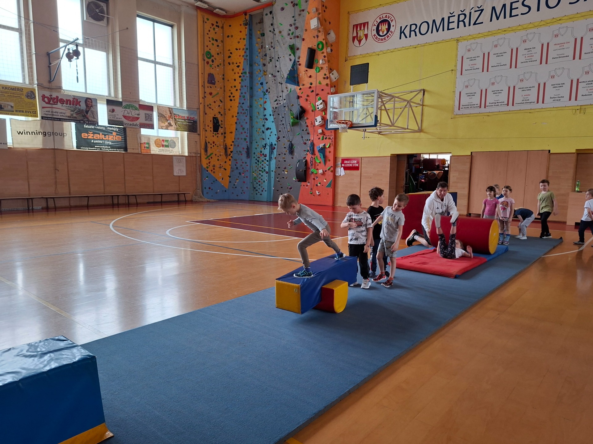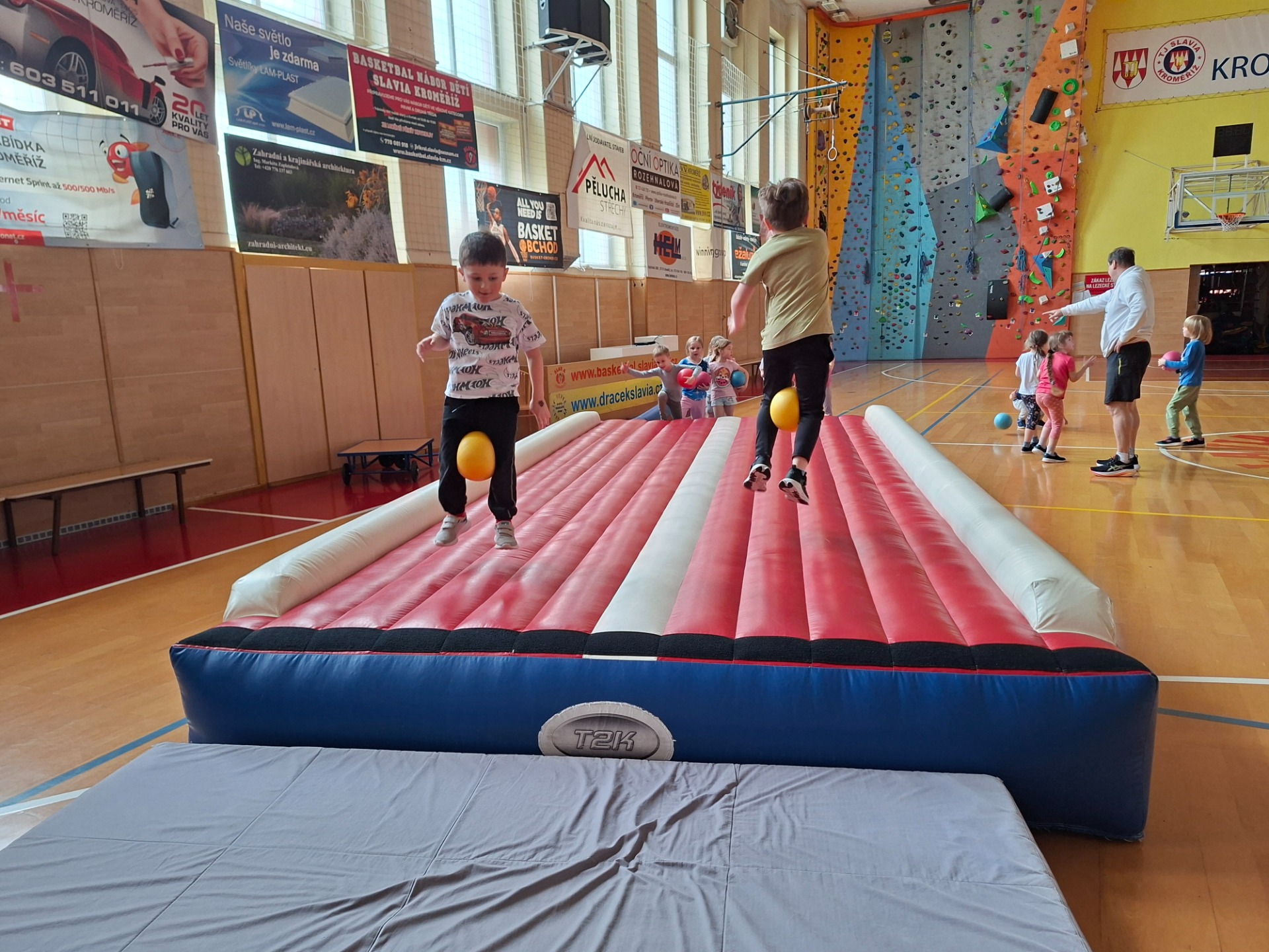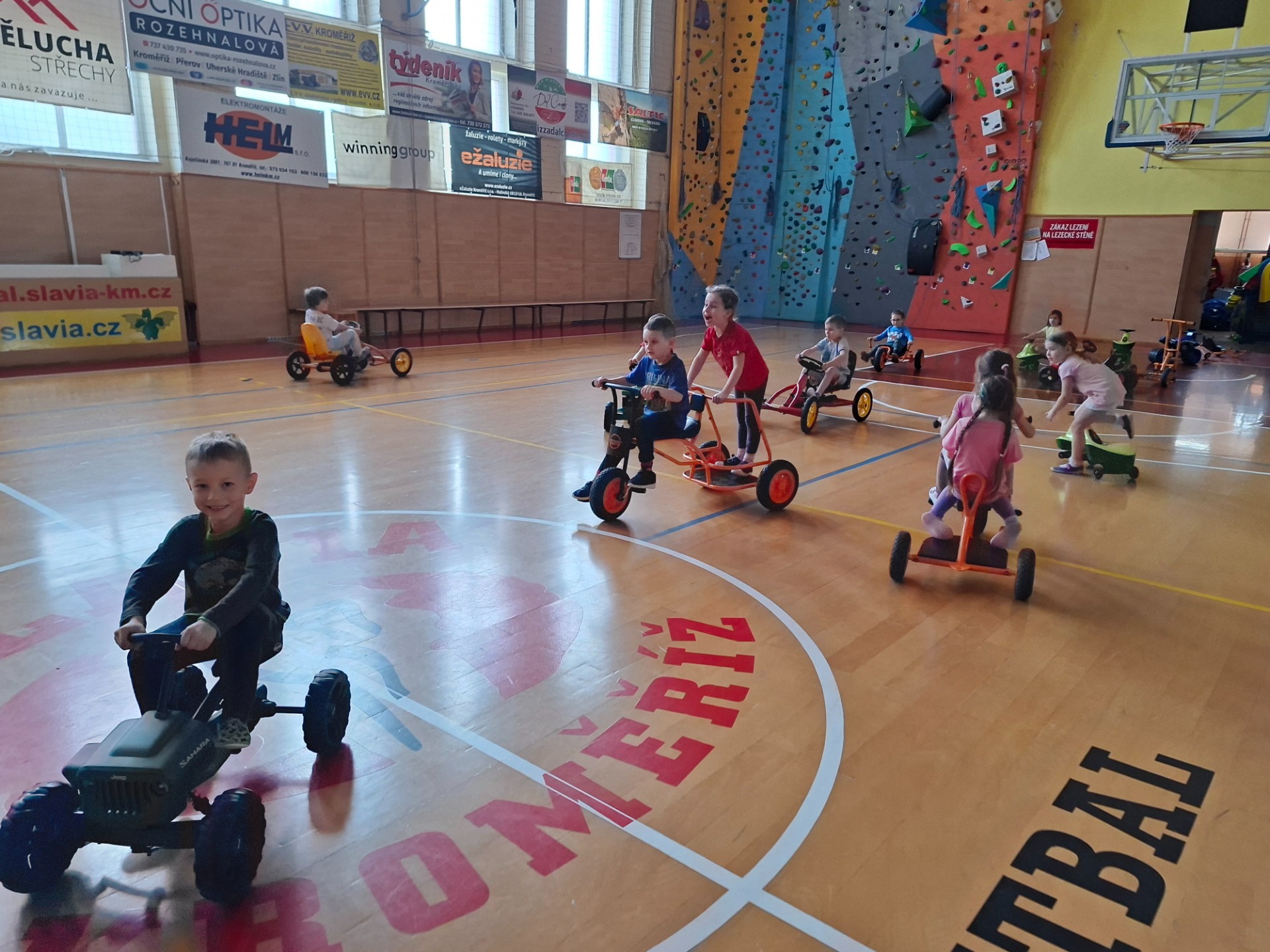 Děti se velmi těšily na cvičení ve velké tělocvičně s panem trenérem. Pro první setkání měl připravenou velkou trampolínu a různé druhy vozítek.