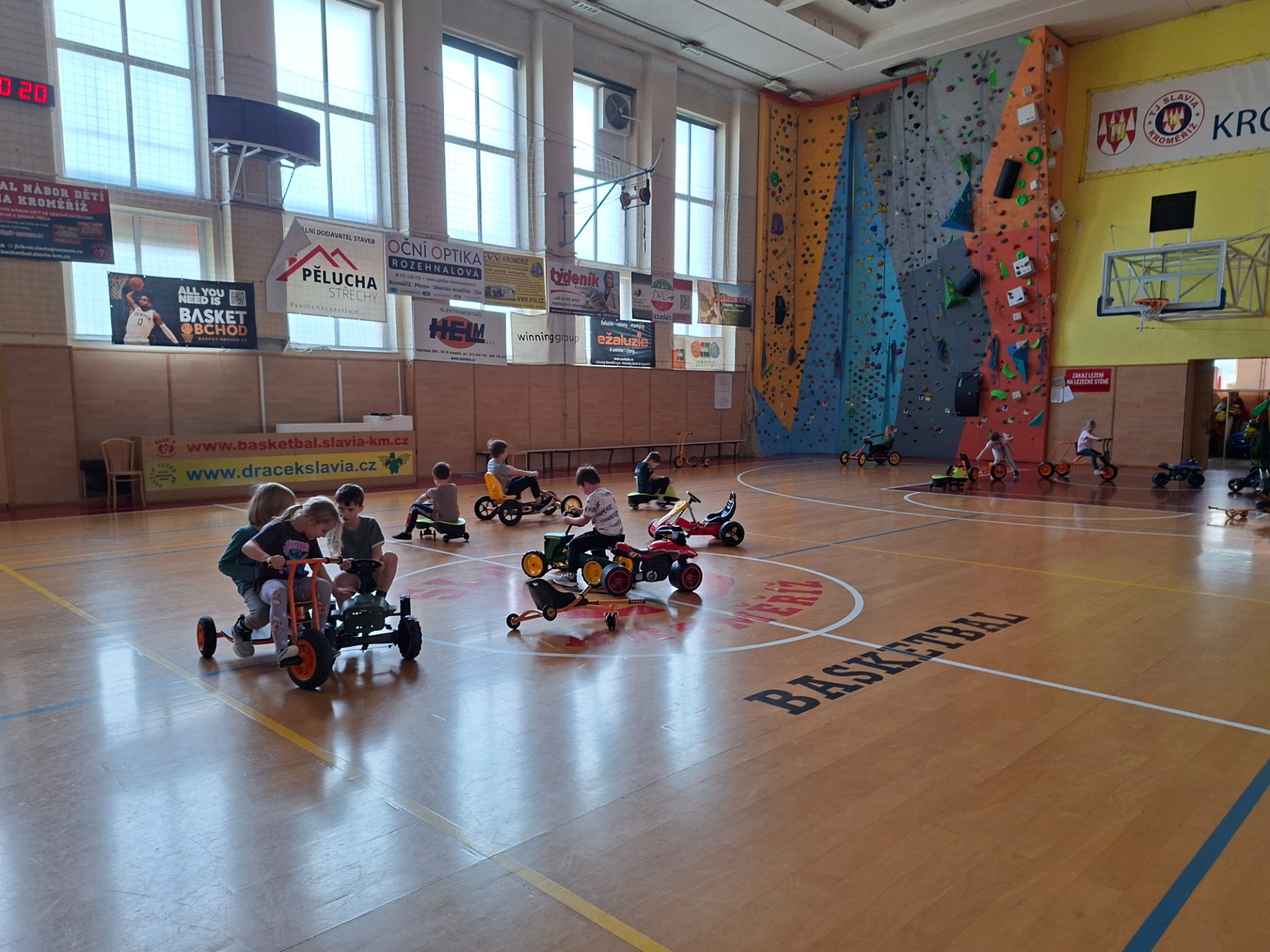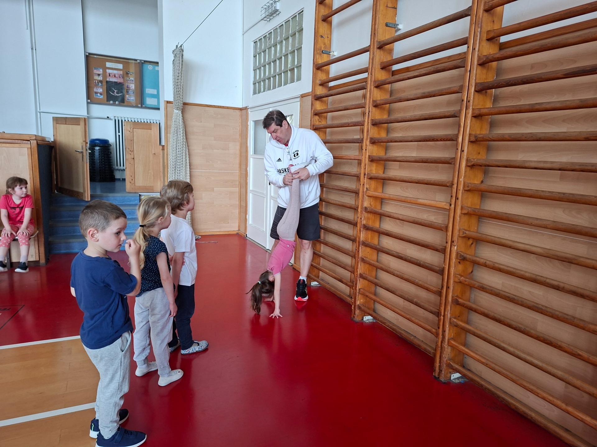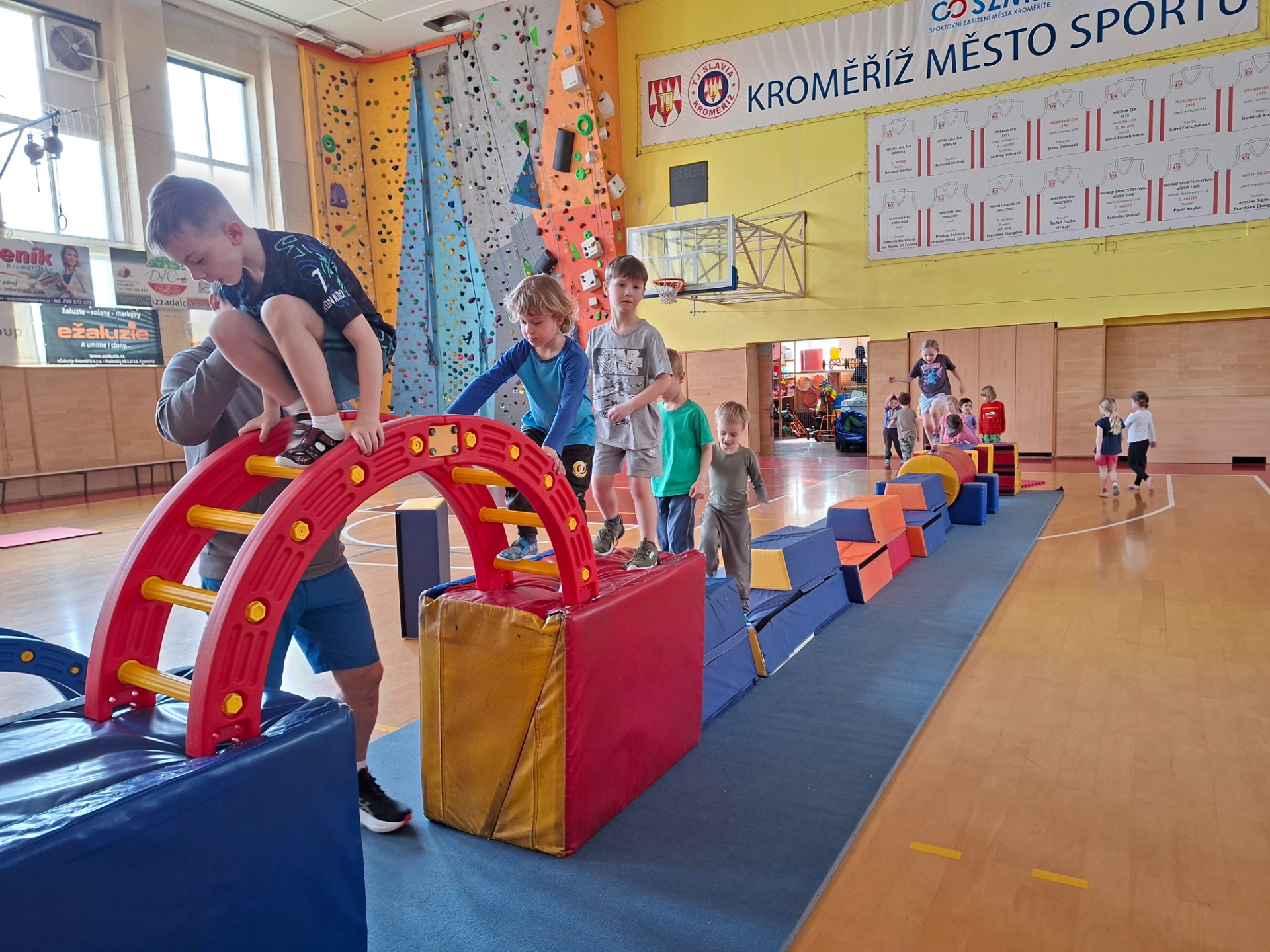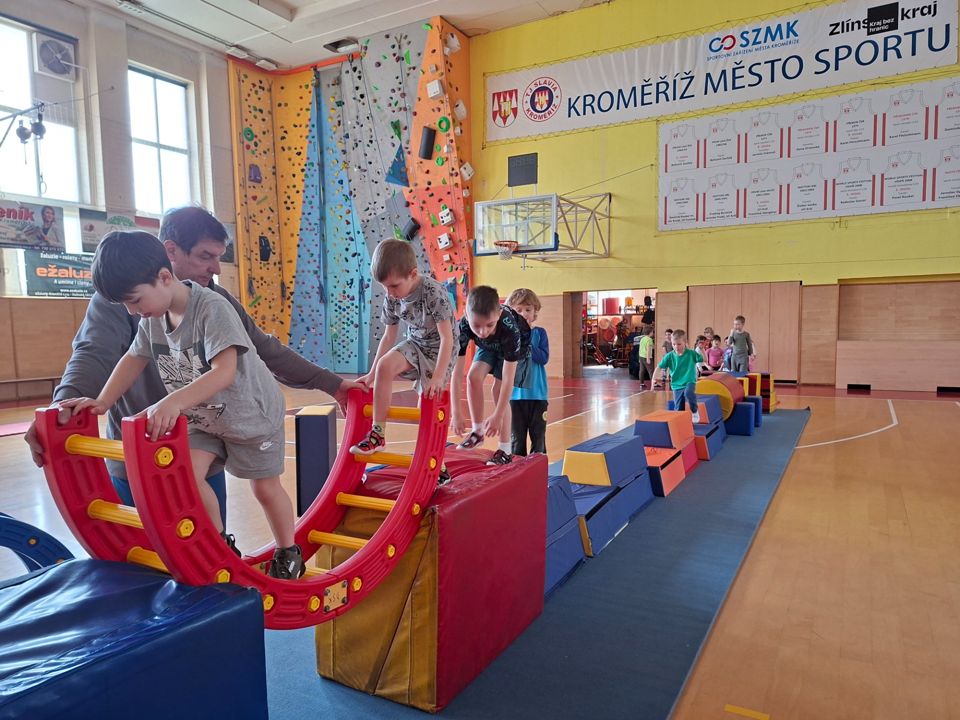 Děti se velmi těšily na cvičení ve velké tělocvičně s panem trenérem. Pro první setkání měl připravenou velkou trampolínu a různé druhy vozítek.