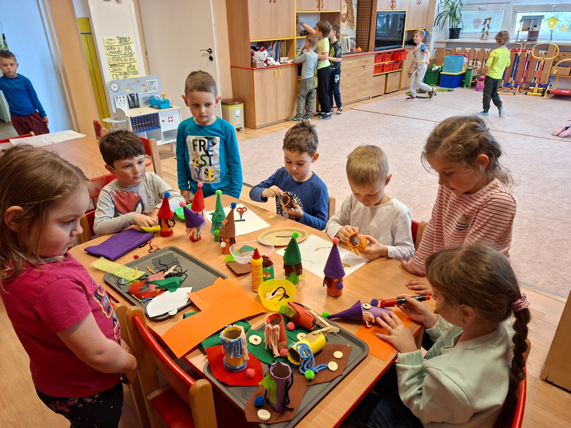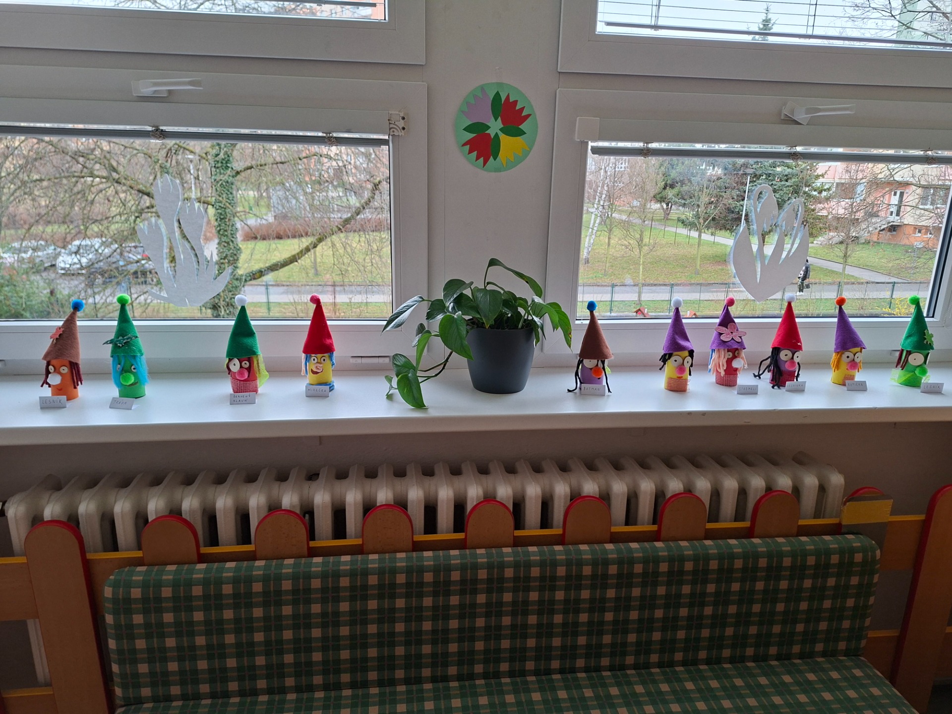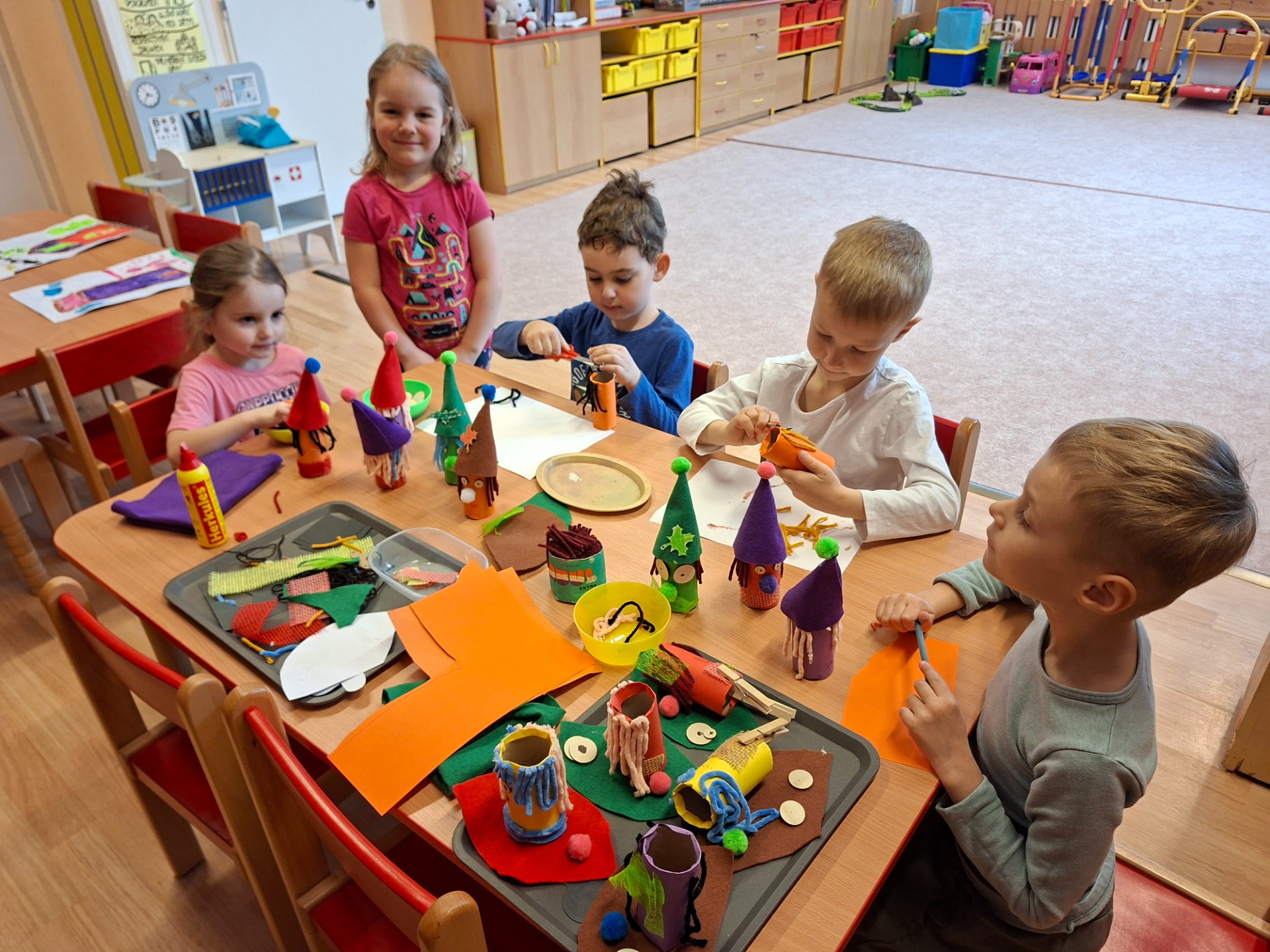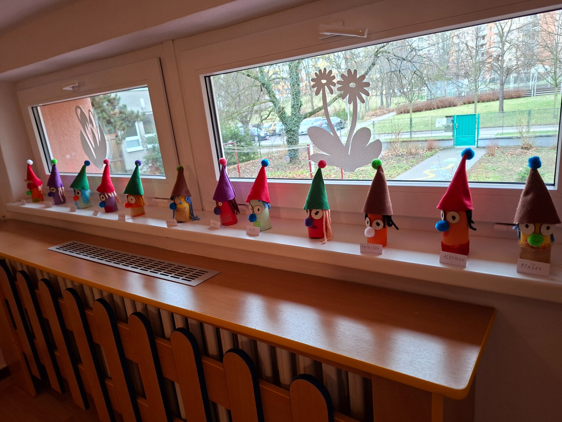 Ve třídě jsme si vyrobily skřítky, kteří budou jako bydlet v domečkách před školkou. Každý dal svému skřítkovi jméno a pověděl co jeho skřítek má rád.