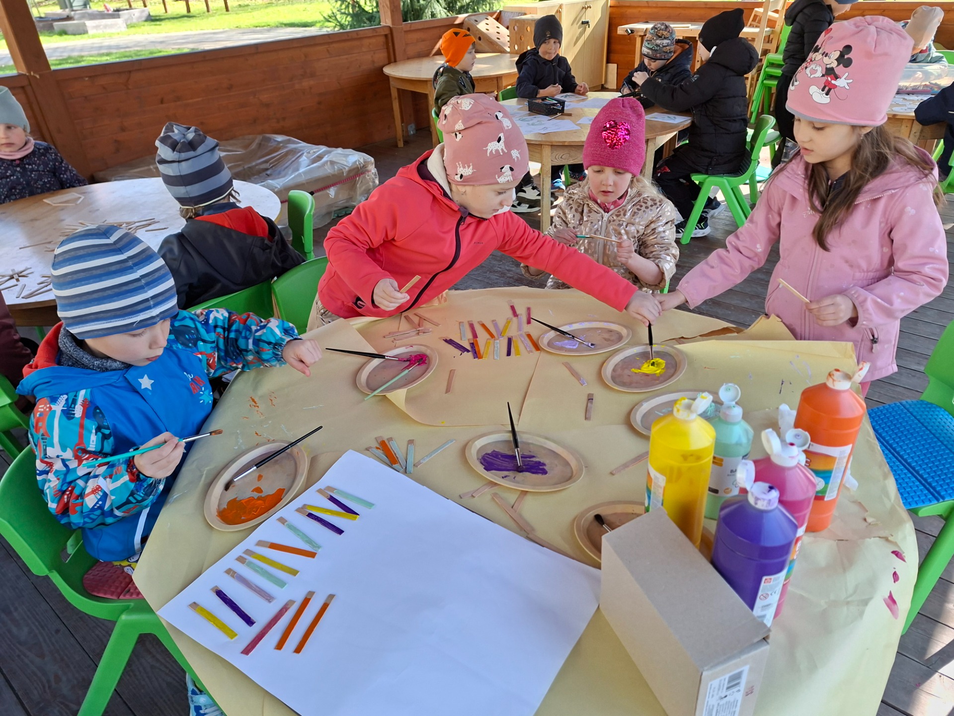 Ve skupinkách děti plnily úkoly na téma "papírový drak" ve venkovní učebně.
