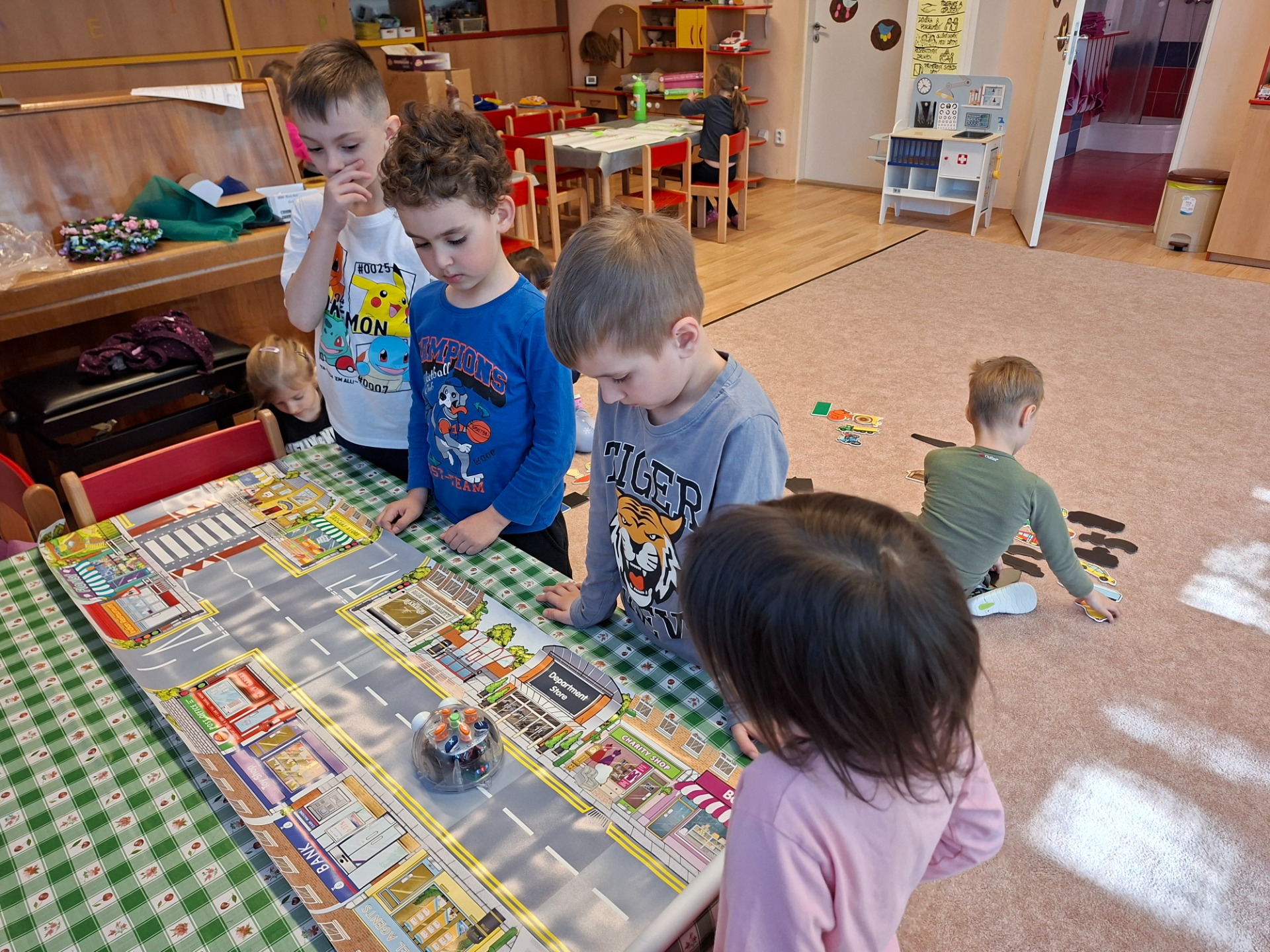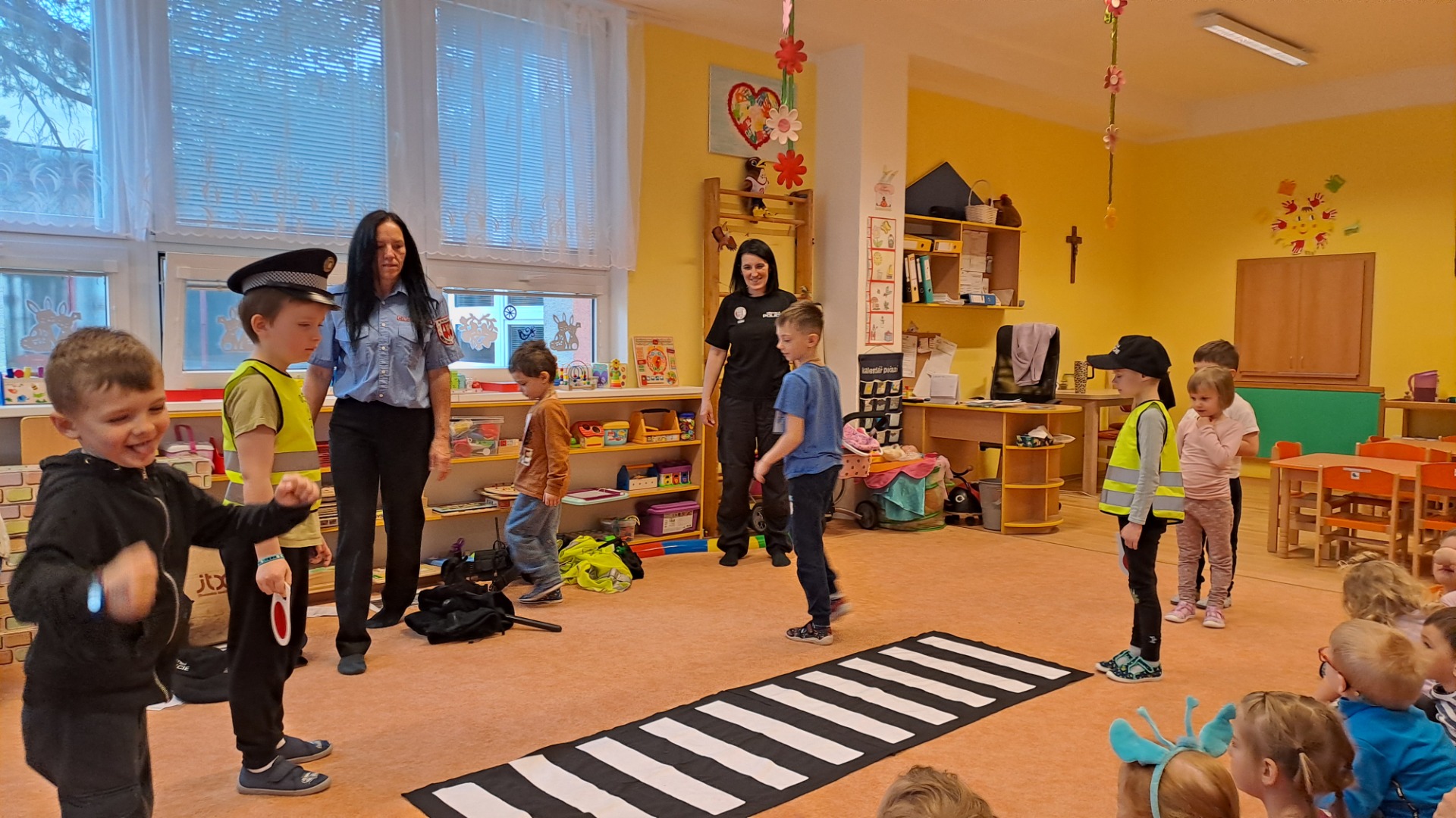 Pod vedení odborníků se děti seznámily s pravidly silničního provozu. Vyzkoušely si jízdu na koloběžkách na zmenšených silnicích se značkami, semafory a vlakovým přejezdem. Seznámily se také s pravidly první pomoci.