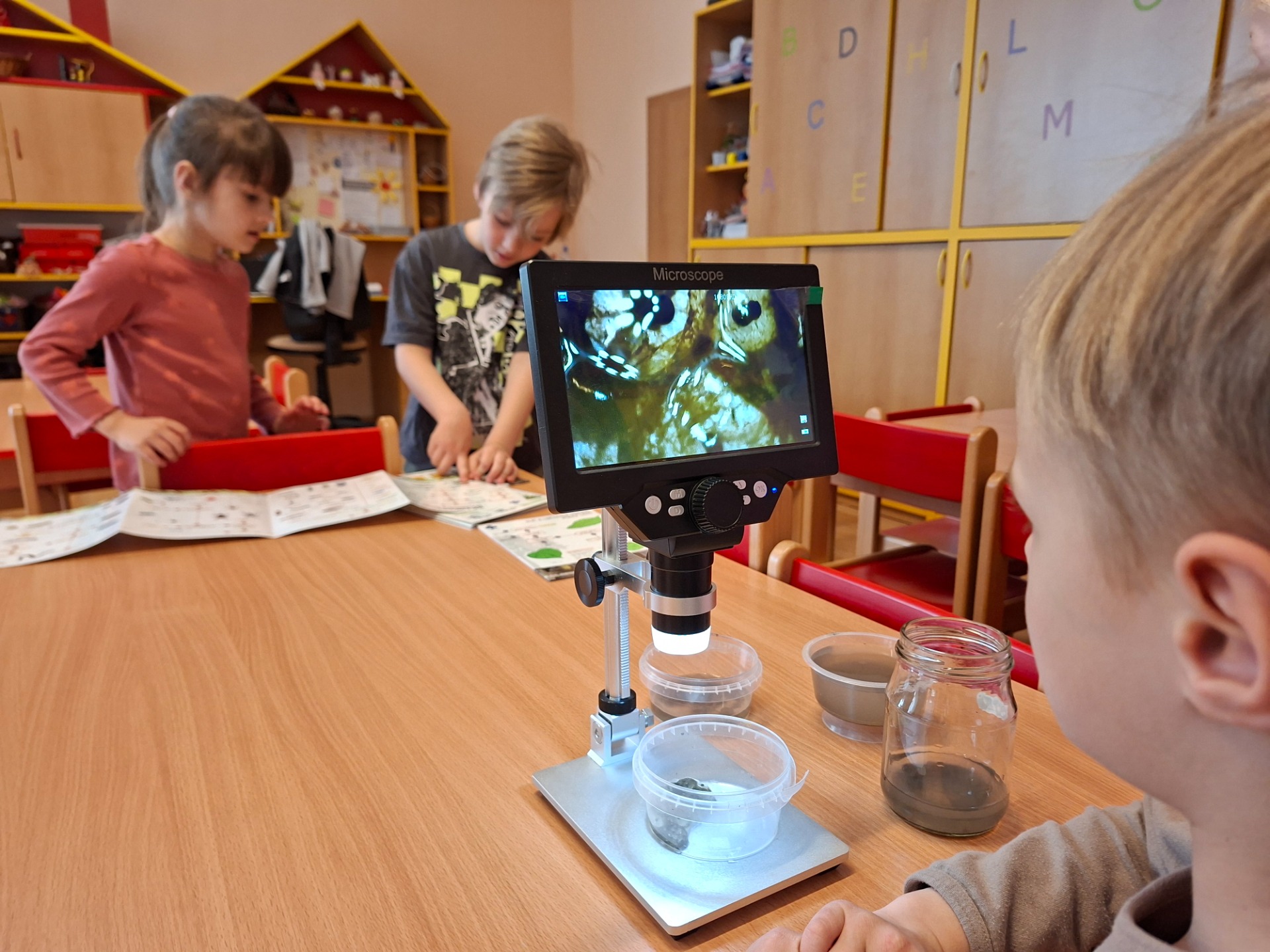 My jsme donesli studánce kytičky, studánka nám dala trochu vody, kterou jsme mohli ve třídě prozkoumat pod digitálním mikroskopem.