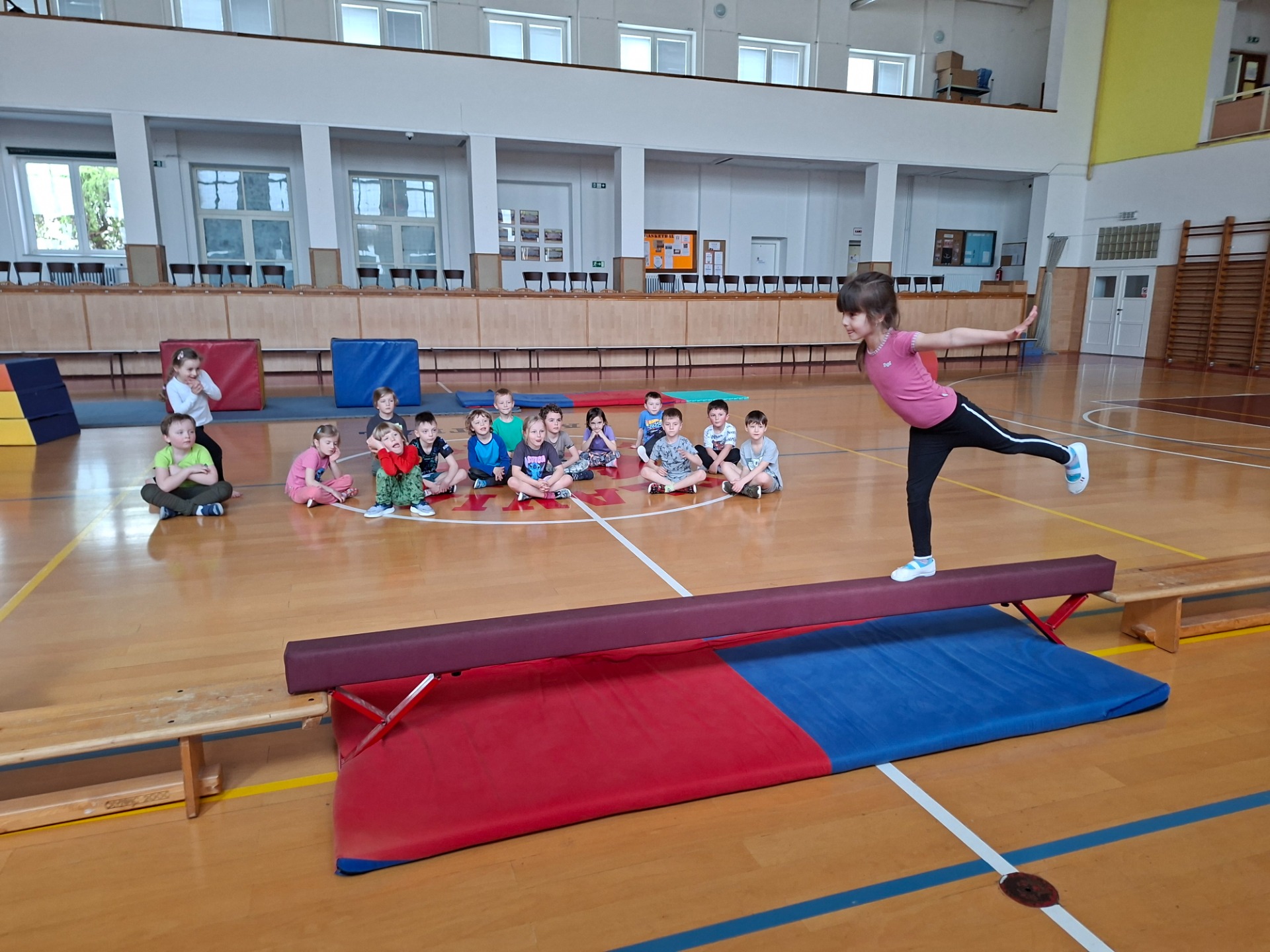 Pohyb ve třídě, v tělocvičně Církevní školy v Podzámecké zahradě.